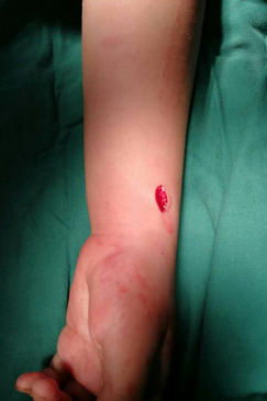 手术后图片:仅有3个克氏针针孔,几乎无疤痕形成,且克氏针外置,术后6周即可拔出克氏针,无需住院开刀取出。
